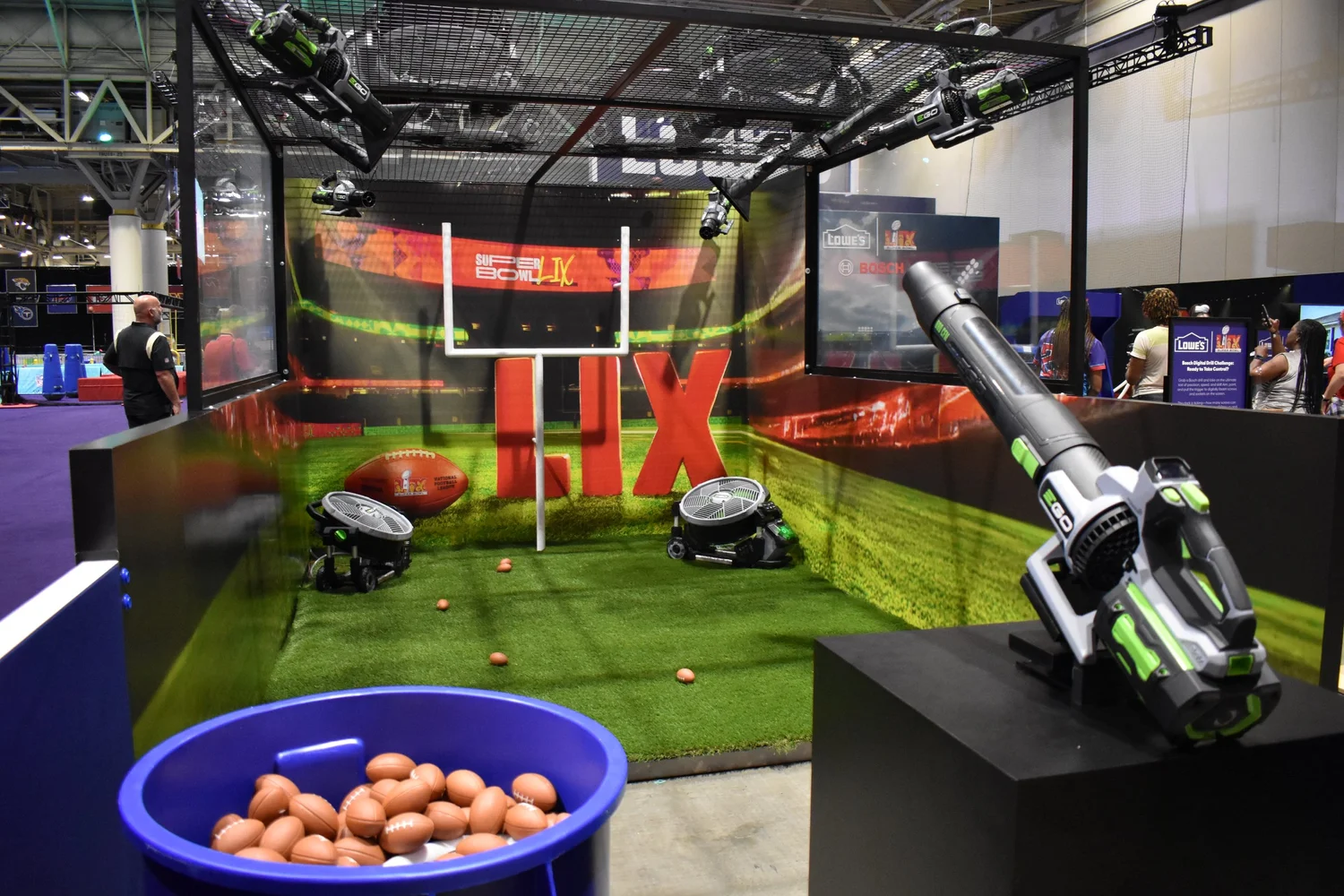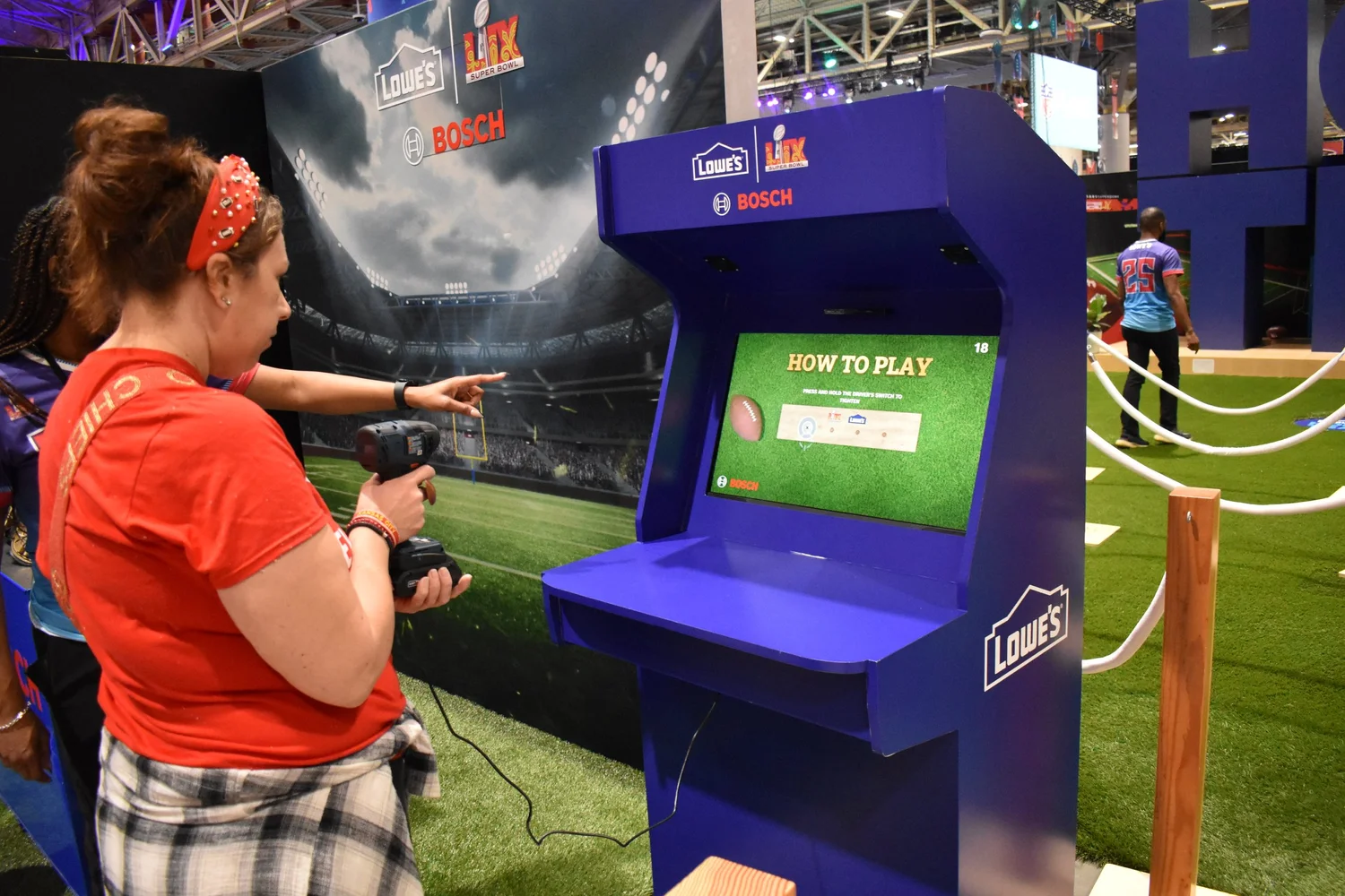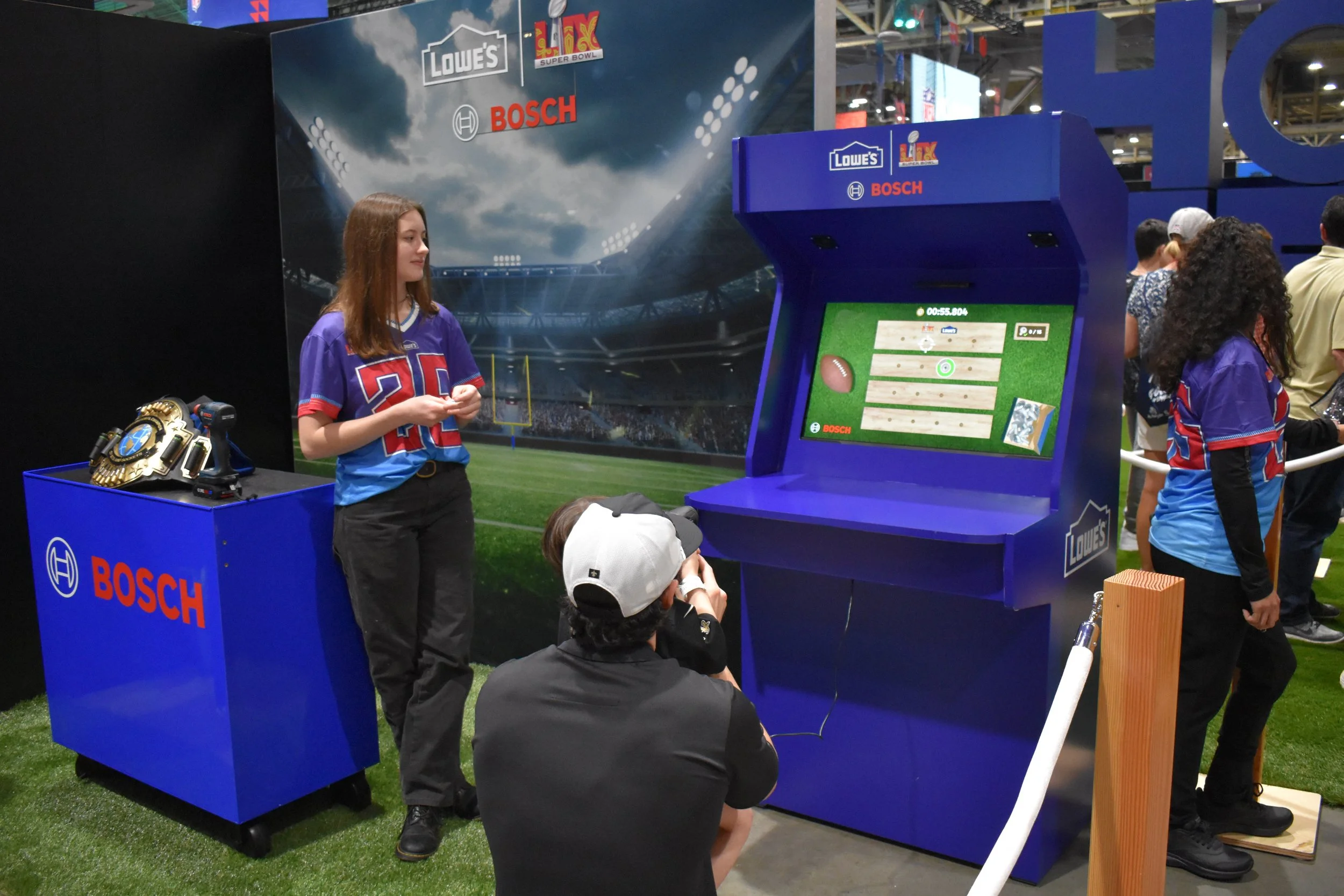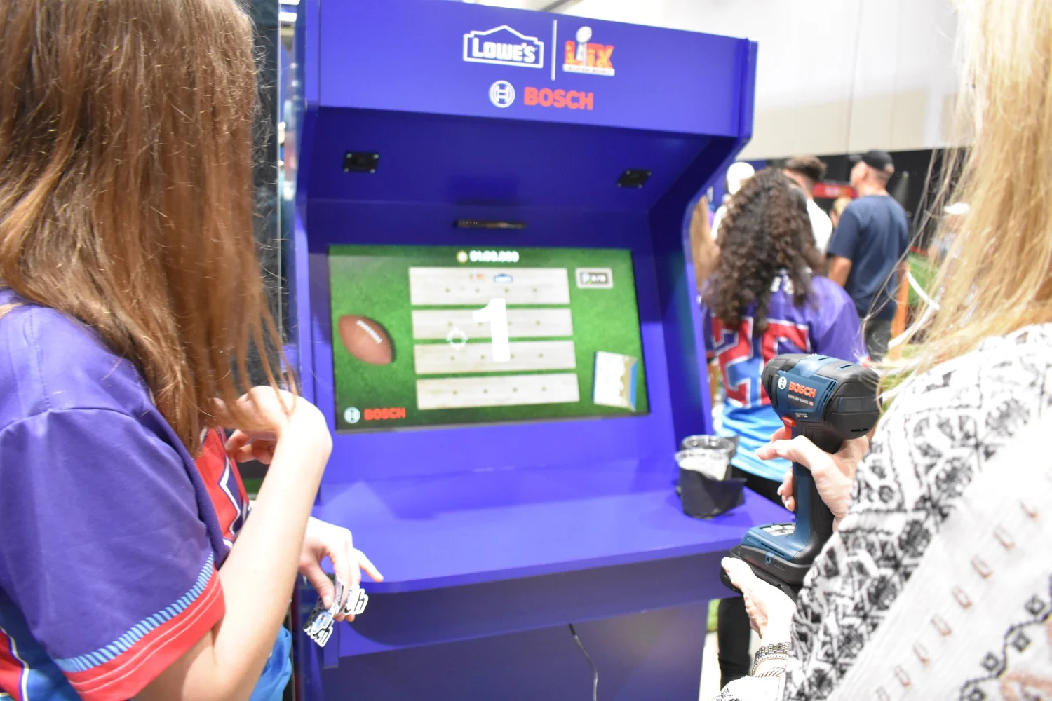 Fans were also drawn to a series of immersive, skill-based challenges, including a giant Super Bowl–inspired slide puzzle that required participants to shift floor tiles into place. Two custom-developed games elevated the experience even further: a blower-powered mini football launch that combined strategy and engineering, and an arcade-style shooter using a Bosch drill that challenged fans to screw in fasteners with speed and precision. Together, these activations transformed DIY tools into playful competition.