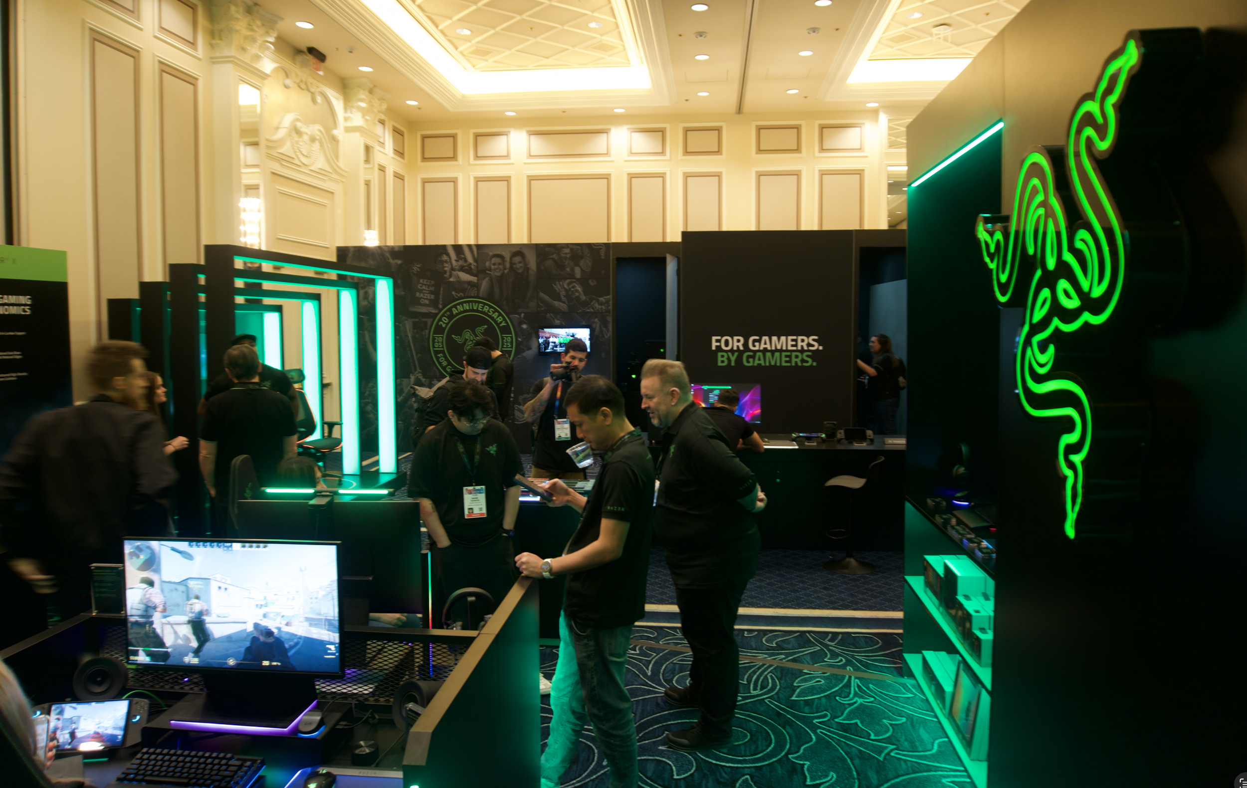 A private ballroom at The Venetian was reimagined as a high-impact Razer environment, balancing bold visual statements with intuitive attendee flow. The experience centered on a dynamic showcase of the Chroma range, paired with a sculptural display featuring two new chair designs. Arch lighting framed each chair to spotlight ergonomic performance, while a striking 3D-printed Razer logo and underlit product shelving anchored the space with unmistakable brand presence.