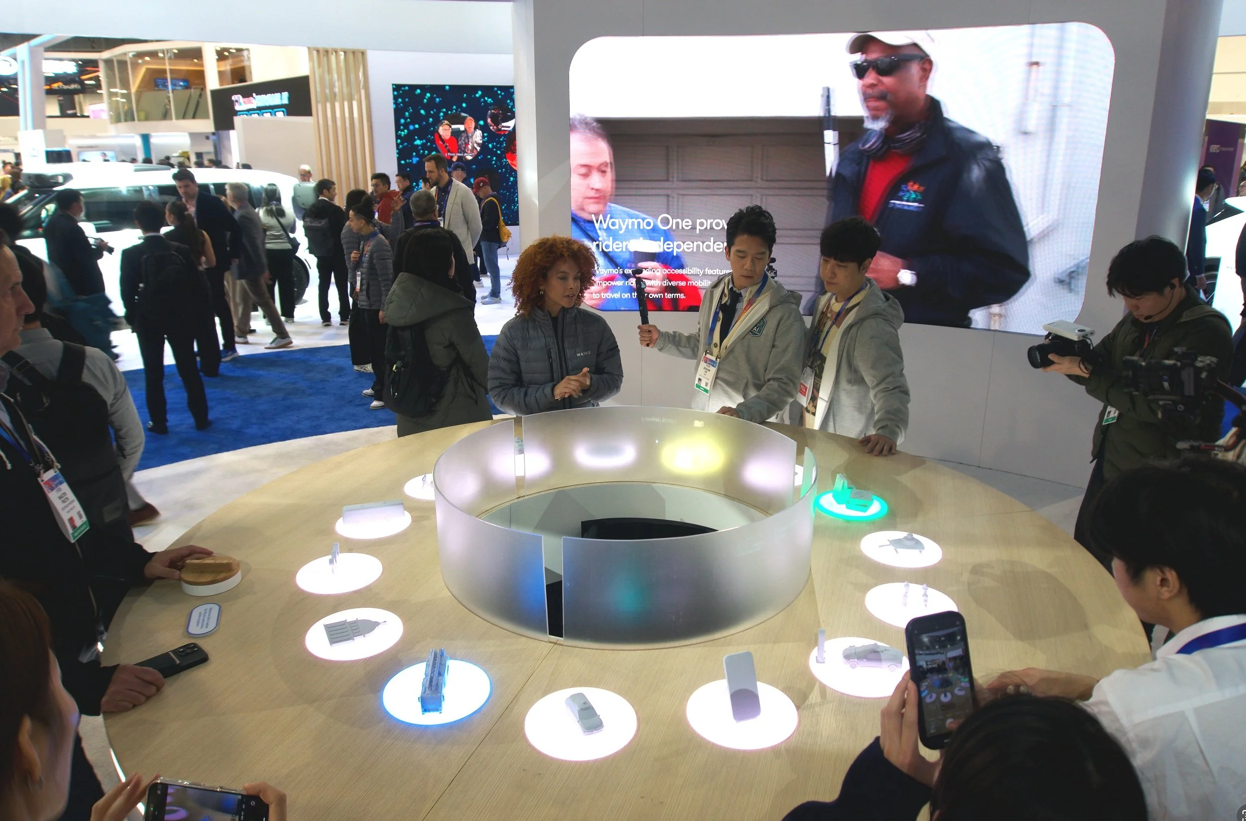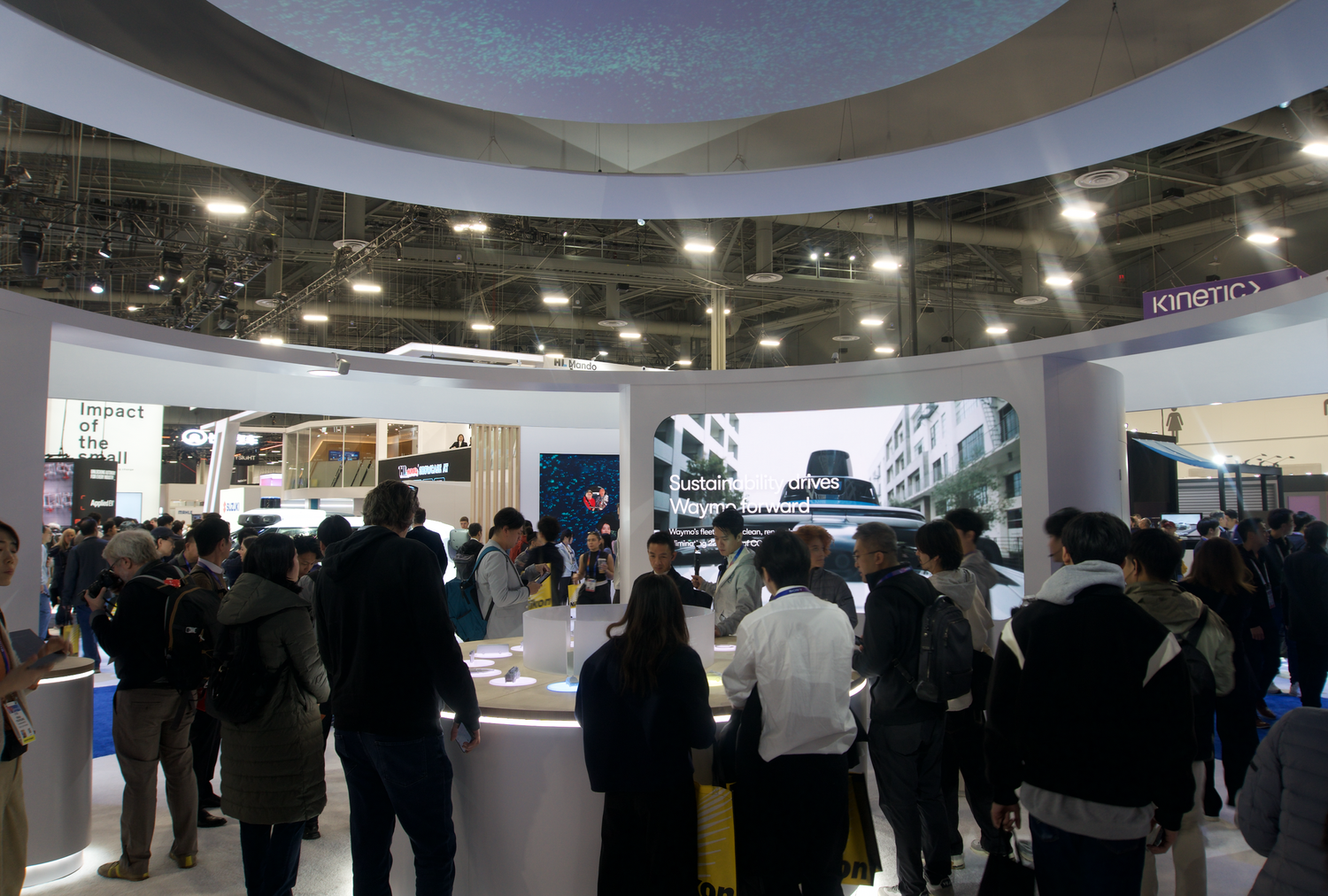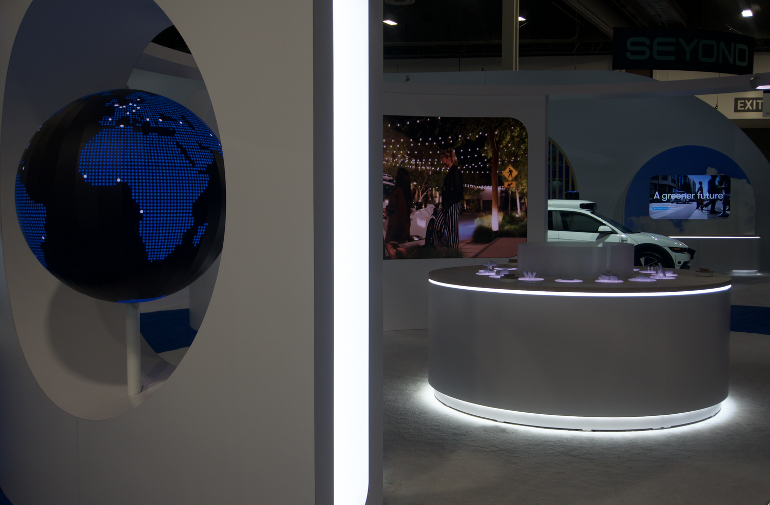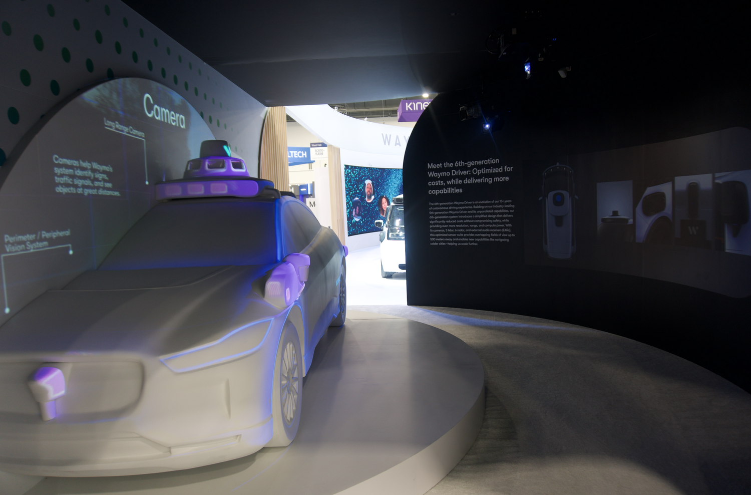 Spanning 6,300 square feet, the Waymo booth highlighted the latest advancements in automated vehicle technology through an immersive and visually striking experience. At its center was a life-sized, 3D projection-mapped Waymo vehicle that drew attendees in, while a curved video wall surrounded the space with rider testimonials and showcased Waymo’s current operating locations. Anchoring the booth was Mission Control, an interactive hub where visitors engaged with illuminated 3D models of vehicles and pedestrians using tactile wooden toggle switches. A 3-foot LED sphere invited participants to suggest future Waymo locations around the globe, reinforcing the brand’s forward-looking vision through hands-on participation.